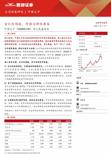 中国太平保险控股有限公司(以下简称“中国太平”或“公司”)作为财政部实际控制的百年综合保险集团,正以其独特的“分红险领航”战略和全牌照协同优势,在行业转型深水区构筑差异化竞争壁垒。我们认为,公司当前核心看点在于:负债端分红险转型领先,资产端具备显著优化空间,叠加国资背景赋予的战略定力与市场弹性,使得中国太平成为兼具价值防御属性与向上成长弹性的稀缺标的。 首次覆盖,给予“买入”评级。
