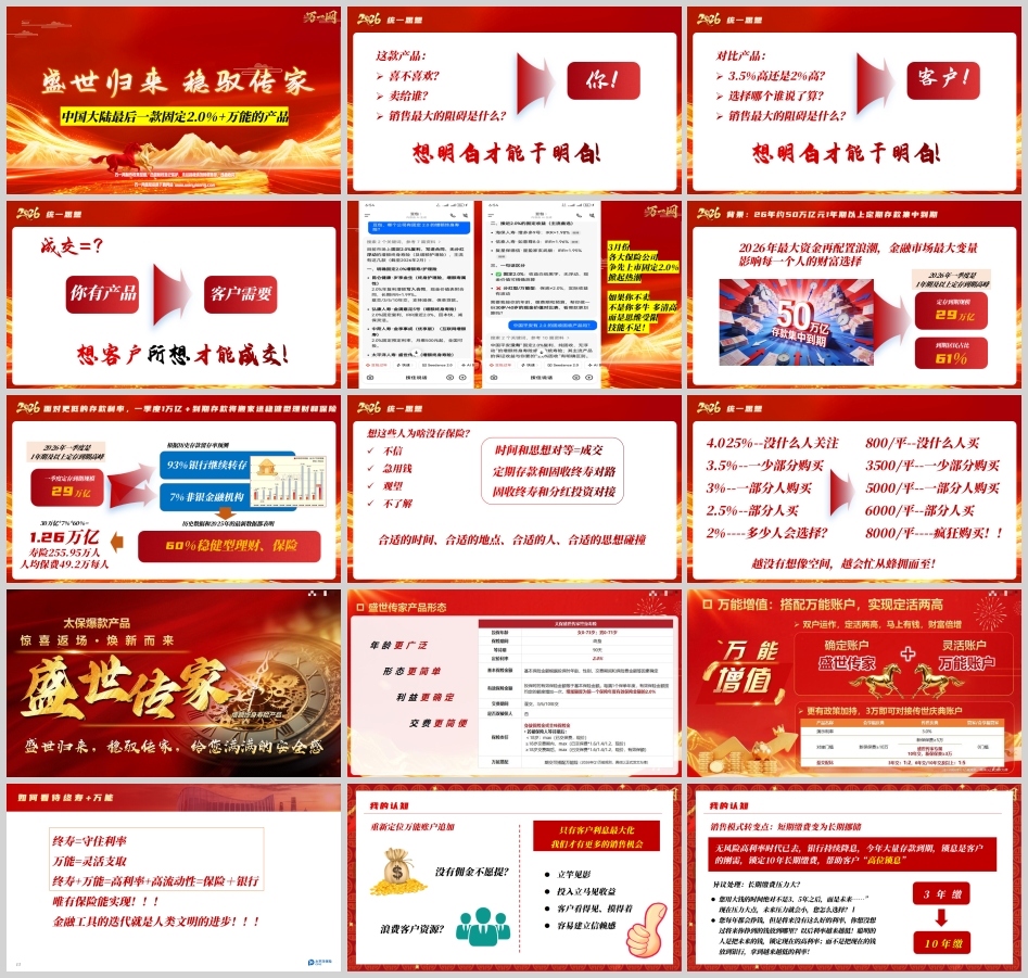 为什么这么多客户过去没有选择保险?根源在于:不信、急用钱、观望、不了解。 而今天,我们手中的“太平洋盛世传家”正是为解决这些问题而生。它是中国大陆最后一款固定利率2.0%+万能账户的产品组合。请记住这个定位,这是历史赋予我们的窗口期。