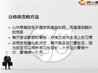 采用自我催化的方式,每天告诉自己要改变,因为改变可以带来学习与成长,一天至少要做十次,要维持一个月