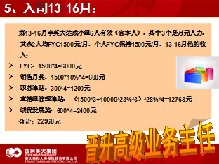 从第四个月起,李英大开始组织发展,三个月新增1人(FYC1500元),个人FYC1500/月,4-6月他的收入: