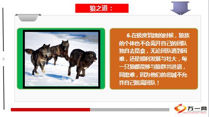 5.忠诚守信,凝聚团队竞争力,狼群中的个体不会表达自己对团队的忠诚,但是它们地用行动演绎了这种忠诚品质的可贵。而我们现代企业需要的也是正是狼群这种从不慈善自己的团队的精神!