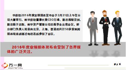 新华保险2016年度业绩媒体发布会于3月31日上午在公司大厦举行。新华保险董事长兼CEO万峰、副总裁黎宗剑、副总裁于志刚、新华资产管理公司总裁李全出席会议。部分部门负责人和来自北京、上海、香港的共计50多家新闻媒体现场或通过电话连线参加了会议。