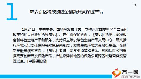 1月24日,中共中央、国务院发布《关于支持河北雄安新区全面深化改革和扩大开放的指导意见》。在生态保护方面,《意见》指出,要积极创新绿色金融产品和服务,支持设立雄安绿色金融产品交易中心,研究推行环境污染责任保险等绿色金融制度,发展生态环境类金融衍生品。在创新投融资模式方面,《意见》要求,要多渠道筹措资金。鼓励保险公司根据需要创新开发保险产品,推进京津冀地区的保险公司跨区域经营备案管理试点。[中国保险报]
