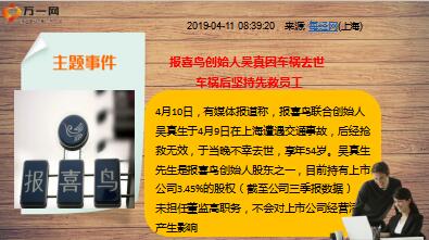4月10日,有媒体报道称,报喜鸟联合创始人吴真生于4月9日在上海遭遇交通事故,后经抢救无效,于当晚不幸去世,享年54岁。吴真生先生是报喜鸟创始人股东之一,目前持有上市公司3.45%的股权(截至公司三季报数据),未担任董监高职务,不会对上市公司经营活动产生影响。