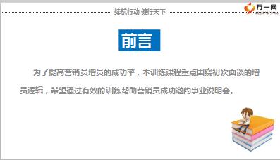 业:王先生,人生不怕重来,就怕没有未来,如果不作出改变,未来就是今天的延续。我觉得以您的能力,如果加入保险业必然能大展宏图。增:听说保险很难做,我怕我不行。业:别人行您也一定能行,何况您懂得销售,许多像您这样有经验的人,来到保险公司都发展的相当好,您不用急着做决定,可以先到我们公司了解一下,本周末就有一场创业说明会。我陪您一起参加,听后再做决定也不迟,您看,到时我去哪里接您?增:就去…..接我吧。第四步,成功邀约,演练要求:三人一组,依次分角色轮流进行面谈训练。一个扮演业务员,依演练稿准备;一个扮演准增员,按准增员心理提出拒绝问题;一个扮演观察者,观察演练情况,给予反馈;演练反馈观察点:一字不差,对话流畅,进入情境,感情投入。