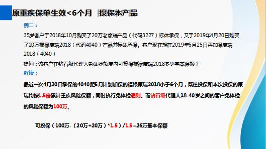 由以上示例得出结论,在计算免体检额度内客户可投保福禄康瑞2018的最大基本保额时遵循以下原则:1. 原重疾保单生效<6个月,以免体检通则的最高风险保额计算。2. 原重疾保单生效≥6个月,以单独核保的免体检最高基本保额计算。