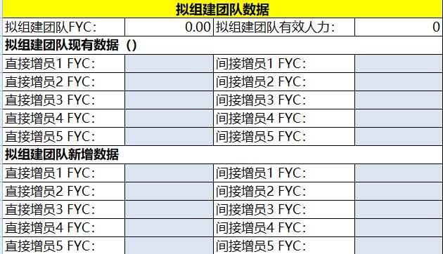 当前职级,准收展员,当前收入,增员后收入,晋升后收入,直接增员1 FYC,间接增员1 FYC,还需有效人力,拟组建团队有效人力,直接推荐有效人力,直辖组有效人力,直辖部有效人力,还需架构,培育组经理数,其中:直接培育组经理数,培育部经理数,其中:直接培育部经理数。