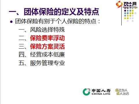 团体保险的定义及特点,团体保险是与个人保险相对应的概念。以团体单位为投保人、团体内的所有成员或部分成员作为被保险人的保险。由保险公司统一签发一张总的保险合同,保险人按合同规定向其团体中的被保险人提供保险保障。根据单位的风险进行评估,进行核保而不是个人;一张保单保障许多人;根据员工个别情况告知,一般不需要个人体检;投保手续简便;一般只保一年,第二年需重新签订合同;保单生效后可以增减人;一、团体保险的定义及特点,团体保险有别于个人保险的特点:一、风险选择特殊,二、保险费率浮动,三、保险方案灵活,四、经营成本低廉,五、服务管理专业。