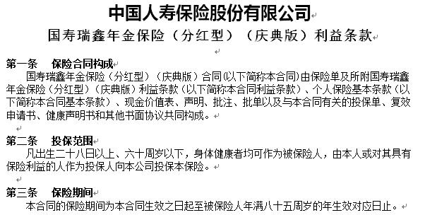 第一条 保险合同构成,国寿瑞鑫年金保险(分红型)(庆典版)合同(以下简称本合同)由保险单及所附国寿瑞鑫年金保险(分红型)(庆典版)利益条款(以下简称本合同利益条款)、个人保险基本条款(以下简称本合同基本条款)、现金价值表、声明、批注、批单以及与本合同有关的投保单、复效申请书、健康声明书和其他书面协议共同构成。第二条 投保范围,凡出生二十八日以上、六十周岁以下,身体健康者均可作为被保险人,由本人或对其具有保险利益的人作为投保人向本公司投保本保险。
