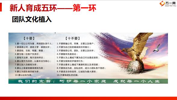 培育五环,留存不难,新人育成五环——第一环,团队文化植入,帮助刚开工号的新伙伴了解家族了解团队,清楚家族及团队的文化、氛围,让新伙伴,更好更容易融入家族和团队。利用入司到新兵营之间的时间再次深入导入保险观念,让新伙伴更认同保险,让新伙伴清楚并遵守着装要求,出席要求,最基本的家族及团队职场,让新人清晰知道自己未来的发展方向,及能力提升,激励新人发展意愿。