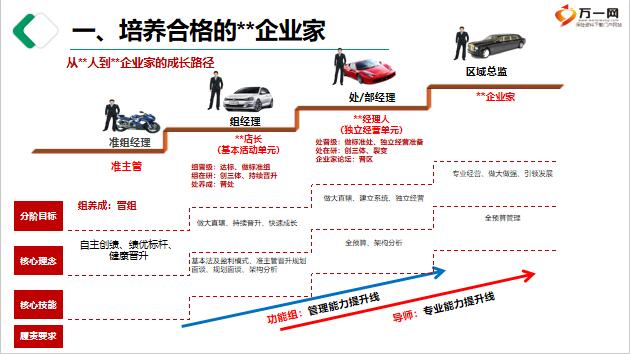 成长平台以三大俱乐部为核心抓手,同时融入导师培养体系,致力于推动主管职级晋升和能力成长,解决聚焦和氛围营造问题,推动主管健康晋升、联动晋升和持续晋升。对不同俱乐部的人员,按计划按时段进行意愿激发,制定目标规划持续运作,表彰目标达成者,激励更广泛群体参与到体系运作中纳入制式培训课程,强化晋升(晋档)的意愿,掌握必备技能承接养成培训 ,围绕晋升进行核心技能训练补强,提升技能,强化激发意愿。高频高效过程管控,盘点目标差距,协助提供改进建议,确保目标达成。晋升操作前完成,帮助新晋人员做好下阶段工作规划,定位主管履职要求和能力要去,之后衔接晋级培训。学习平台是以主管理念塑造和能力培养为基本诉求,以制式培训为主要载体,通过对各层级主管实施系统化的培训,从而达成根植**企业家发展理念、提高主管综合能力的目标。学习平台包括的内容分为公司层面、个人层面;其中公司层面包含面授培 训和在线学习、个人层面包含制式培 训和自学平台。