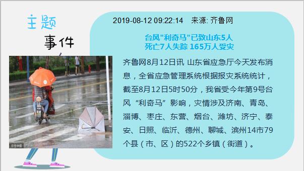 齐鲁网8月12日讯 山东省应急厅今天发布消息,全省应急管理系统根据报灾系统统计,截至8月12日5时50分,我省受今年第9号台风“利奇马”影响,灾情涉及济南、青岛、淄博、枣庄、东营、烟台、潍坊、济宁、泰安、日照、临沂、德州、聊城、滨州14市79个县(市、区)的522个乡镇(街道)。