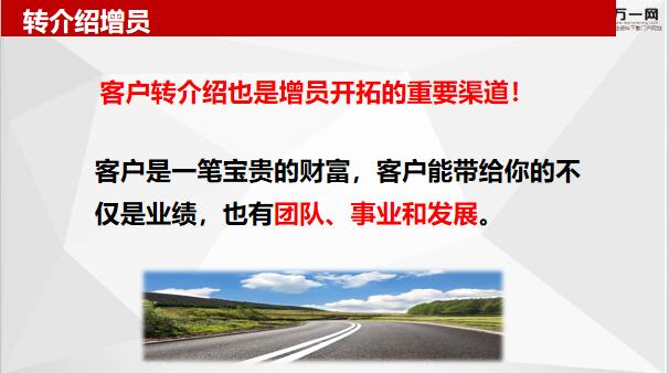 说明来意,“我们公司很想在这边的市场开拓业务,但个人的力量是微弱的,需要找几个像你这么优秀而且有责任心的人来负责。”赞美肯定,“我感觉你很合适,而且您的形象气质现在不需要你马上做出决定,正好,这个周末我们公司正好有一个创业说明会。我特地为你申请了一张门票,你到时抽空去听一下,了解一下**人寿及保险行业发展的前景,到时再做决定也不迟。明天上午九点,不见不散。转介绍增员的流程,1、客户转介绍也是增员开拓的重要渠道:较高的人员素质、较高的保险认同、较低的增员成本、较低的增员压力。2、做好客户转介绍增员的关键:建立客户转介绍增员流程并持续行动。3、客户转介绍增员流程:提出转介绍要求、初次见面、邀约面谈。四、转介绍客户增员的关键点。