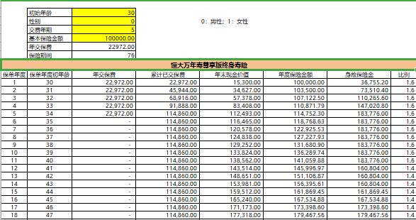 恒大万年寿尊享版终身寿险,,初始年龄,性别,交费年期,基本保险金额,年交保费,保险期间。