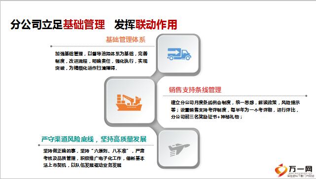 基础管理体系,加强基础管理,以督导追踪体系为基础,完善制度,改进流程,明确责任,强化执行,实现突破,为精细化运作扫清障碍。销售支持条线管理,建立分公司月度条线例会制度,统一思想,解读政策,风险提示等;设置销售支持考评制度,每半年为一个考评期,进行评比,分公司前三名奖励证书+神秘礼物;严守渠道风险底线,坚持高质量发展,坚持做正确的事,坚持“六原则、八不准”,严肃考核及品质管理,积极推广电子化工作,借新基本法上市契机,以队伍发展驱动业务发展,我们是合作关系,而不应该一直处于上下级管理关系。我们应该采取切实有效的措施,抓好团队建设,凝聚团队力量,推动机构合规,健康,稳健的发展。