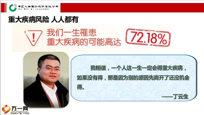 第三部分:重大疾病有1/3可以规范治疗延长寿命,中国肿瘤的误诊率高达30%~40%,误治率更高,例:上海复旦肿瘤医院是我们国家乳腺癌治疗水平最高的医院,很多病例,在其他地方诊断了乳腺癌,去上海就发现不是乳腺癌;在很多地方都需要切,在上海就不用切;很多地方都说要放化疗,上海不需要。所以,一旦确认有重大疾病,一定要在多家医院诊断,寻求规范治疗,通过规范的治疗,能更好的提高生命质量,延长生存期。第四部分:重大疾病不重,财务支持是关键,大家来看这张标准普尔家庭资产配置图,我们需要将我们自己20%的资产作为保命的钱,以更好的应对重大疾病或是意外事故,以小博大起到杠杠作用,通过购买足额重大疾病险,保障家庭经济健康,做好财务支持,能最大限度缓解经济负担。