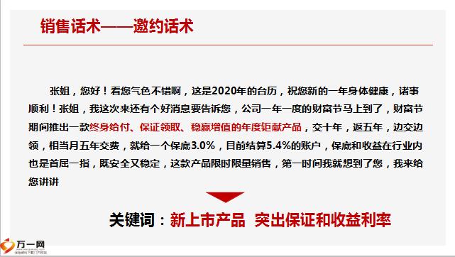 销售话术——邀约话术,张姐,您好!临近年关了,给您送本台历,顺便有一个好消息告诉你,您今天下午还是明天上午有时间,我们见个面,给您把东西送过去。张姐,您好!看您气色不错啊,这是2020年的台历,祝您新的一年身体健康,诸事顺利!张姐,我这次来还有个好消息要告诉您,公司一年一度的财富节马上到了,财富节期间推出一款终身给付、保证领取、稳赢增值的年度钜献产品,交十年,返五年,边交边领,相当月五年交费,就给一个保底3.0%,目前结算5.4%的账户,保底和收益在行业内也是首屈一指,既安全又稳定,这款产品限时限量销售,第一时间我就想到了您,我来给您讲讲。
