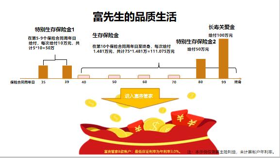 张姐,这是一款富德生命人寿专属打造的避税还增值的传家宝产品。它可以给您本金百分百安全,收益百分百稳健,财富百分百传承。这款产品可以给您提供 1、特别生存金1:在第5-9个保险合同周年日开始给付,每次给付10万元,共计5*10=50万。2、生存保险金:在第10个保险合同周年日至终身,每次给付2.6万元,共计55*2.6万=25万元。3、特别生存金2:满80周岁给付50万元。4、长寿关爱金:满99周岁给付100万元。 搭载了公司目前结算利率为5.4%的万能金账户,真正做到资产的保值、增值。张姐,您现在开始存钱,返还的生存金不领取进入管家账户实现财富二次增值(以低档演示)80岁可传承金额达到了244万,实现2.4倍传承,90岁可传承金额达到了349万,实现3.5倍传承,100岁可传承金额达到了579万,实现5.8倍传承。一份传家宝,世代永流传。真正的财富不在于赚了多少,而在于能传承多少。您认识的金总为自己做了100万的规划,您比他更睿智,100万够吗?