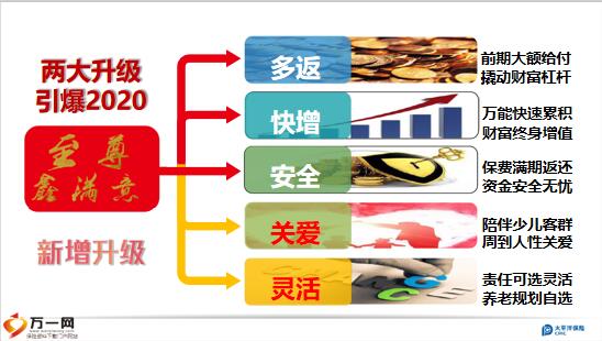 两大升级,引爆2020,前期大额给付,撬动财富杠杆,万能快速累积,财富终身增值,保费满期返还,资金安全无忧,陪伴少儿客群,周到人性关爱,责任可选灵活,养老规划自选关爱,投保人意外身故关怀:未成年被保险人,交费期内投保人意外身故或全残,给付创业婚嫁陪伴金。搭配投保人意外保费豁免,彰显周到人性关怀。注:投保时被保险人未满51周岁的,养老金领取年龄为60周岁;投保时被保险人年满51周岁的,养老金领取年龄为65周岁。养老金领取选择权:可选领取养老金,养老生活自定义。