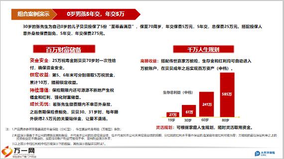 千万人生规划,高额收益:搭配传世赢家万能险,生存金和红利均可自动进入,万能账户,在贝贝成年之后实现百万资产(中档)。灵活规划:可根据家庭人生规划,随时灵活取用资金。持续增值:保险期限内还可源源不断地产生祝福金和红利,强化财富储备。成长无忧:若张先生缴费期内不幸意外身故,之后各期保险费豁免,贝贝30、31岁时,每年额外获得2.5万元的关爱陪伴金,让爱不退场。注:1.产品具体参照至尊鑫满意年金保险(分红型)、传世赢家终身寿险(万能型)条款;2.利益演示是基于本公司的精算及其他假设,不代表本公司的历史经营业绩,也不代表对本公司未来经营业绩的预期,分红险的红利水平是不保证的,在某些年度红利可能为零;万能险的最低保证利率之上的投资收益是不确定的,实际保单账户利益可能低于中、高档利益演示水平;3.以上展示中档红利和中档万能演示下的数据,其他演示数据详见附录1。红利金根据经营状况每年派发,自动进入万能账户实现日计息、月复利,寿命越长,财富越多,血脉相传。