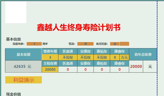 鑫越人生终身寿险计划书,基本保额,缴费年期,医惠通,安康保,康佑保,康睿保。