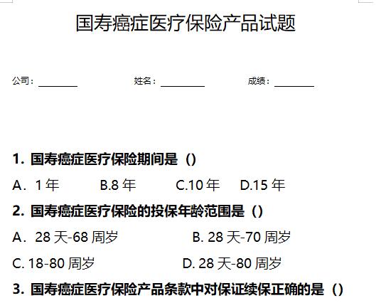 国寿癌症医疗保险产品免赔额是()A.1万元B.0.5万元C.0元6. 国寿癌症医疗保险产品条款中不属于保险责任的是()A.住院医疗费用保险金B. 特殊门诊医疗费用保险金C. 住院前后门(急)诊医疗费用保险金D. 住院医疗费用提前垫付保险金。