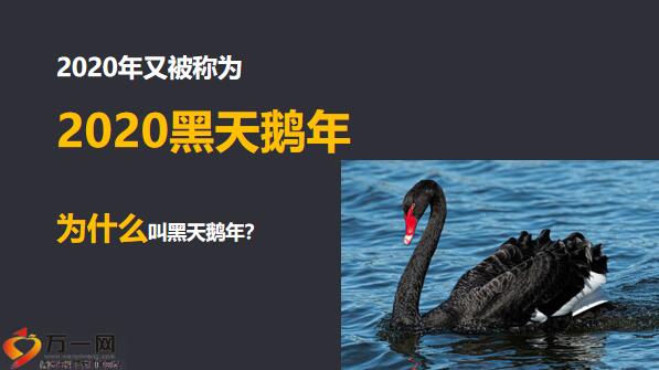 疫情之后在发现澳大利亚的黑天鹅之前,17世纪之前的欧洲人认为天鹅都是白色的。但随着第一只黑天鹅的出现,这个不可动摇的观念崩溃了。现用来表示:不可预测的重大稀有事件,它在意料之外,一旦发生却又改变着一切(9.11事件、美国的次贷危机·····)具有三大特点:2020年超级黑天鹅——全球股市动荡,想不到一个月见证了4次历史,金融市场是预期驱动的,股市震荡反应的不只是短期冲击,更是对实体经济长期萧条的恐惧和顾虑中小企业资金链断裂,濒临倒闭大企业发薪减半,员工被动失业金融市场的动荡会与实体经济风险裹挟在一起,冲击社会的方方面面。