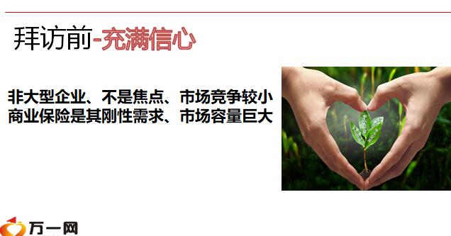 小企业拜访要领团险市场的业务重心由传统的价格竞争转向服务竞争。团险市场的拓展重心由大型企业拓展转向小微企业拓展。,拜访前-充满信心,非大型企业、不是焦点、市场竞争较小商业保险是其刚性需求、市场容量巨大,拜访前-寻找客户1.关注电视报刊:奠基、开业、进驻、广告2.关注网络新闻:政府网、企业网、小微政策拜访前-工具准备工具一:名片 ,工具二:小微企业商业保险需求金字塔图,工具三:市场调查问卷 ,具四:定制产品计划书,工具五:服务承诺书,工具六:致广大商铺业主的一封信,拜访时-拜访要领1.明确拜访目标:收集客户信息收集内容:a、单位人数(管理人员和员工)b、做什么产品(风险职业类别评估)。